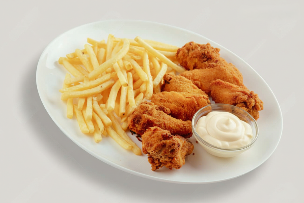 Meniu crispy de pui cu cartofi prajiti si sos maioneza cu usturoi 200/150/30